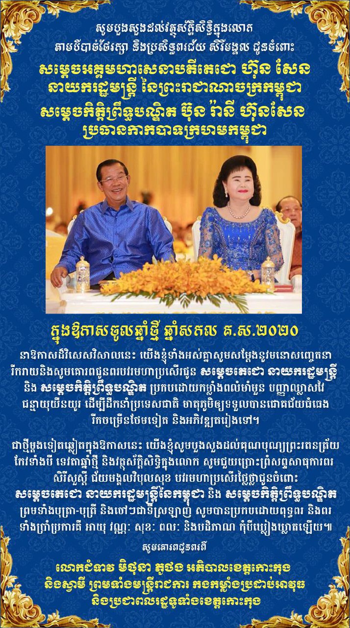 លោកជំទាវ មិថុនា ភូថង អភិបាល នៃគណៈអភិបាលខេត្តកោះកុង និងស្វាមី ព្រមទាំងមន្រ្តីរាជការ កងកម្លាំងប្រដាប់អាវុធ និងប្រជាពលរដ្ឋទូទាំងខេត្តកោះកុង សូមគោរពជូនពរ សម្ដេចអគ្គមហាសេនាបតីតេជោ ហ៊ុន សែន នាយករដ្ឋមន្ត្រី នៃកម្ពុជា និង សម្តេចកិត្តិព្រឹទ្ធបណ្ឌិត ប៊ុន រ៉ានី ហ៊ុនសែន ប្រធានកាកបាទក្រហមកម្ពុជា ក្នុងឱកាសចូលឆ្នាំថ្មី ឆ្នាំសកល គ.ស ២០២០