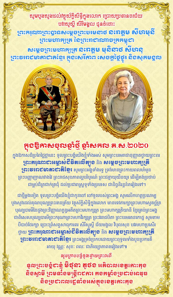 ទូលព្រះបង្គំជាខ្ញុំ មិថុនា ភូថង អភិបាល នៃគណៈអភិបាលខេត្តកោះកុង និងស្វាមី ព្រមទាំងមន្រ្តីរាជការ កងកម្លាំងប្រដាប់អាវុធ និងប្រជាពលរដ្ឋទាំងអស់ សូមព្រះបរមរាជានុញ្ញាត ក្រាបបង្គំទូលថ្វាយសារលិខិត ថ្វាយព្រះពរ ព្រះករុណាព្រះបាទសម្តេចព្រះបរមនាថ នរោត្តម សីហមុនី ព្រះមហាក្សត្រនៃកម្ពុជា ជាទីគោរពសក្ការៈដ៏ខ្ពង់ខ្ពស់បំផុត និងសម្តេចព្រះមហាក្សត្រី នរោត្តម មុនិនាថ សីហនុ ព្រះវររាជមាតាជាតិខ្មែរ ក្នុងឱកាសចូលឆ្នាំថ្មី ឆ្នាំសកល គ.ស ២០២០
