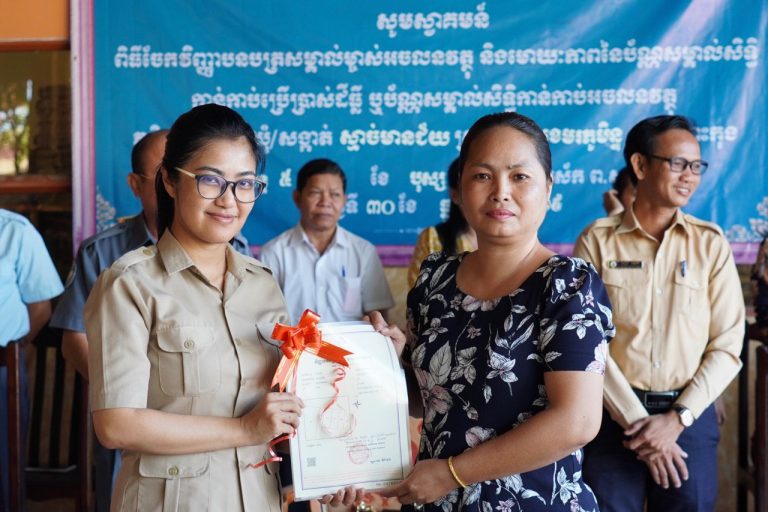 លោកជំទាវ មិថុនា ភូថង អភិបាល នៃគណៈអភិបាល ខេត្តកោះកុង បានអញ្ជើញជាអធិបតី ក្នុងពិធីចែកវិញ្ញាបនបត្រសម្គាល់ម្ចាស់អចលនវត្ថុ ជូនប្រជាពលរដ្ឋ នៅភូមិ២ សង្កាត់ស្មាច់មានជ័យ ក្រុងខេមរភូមិន្ទ ខេត្តកោះកុង
