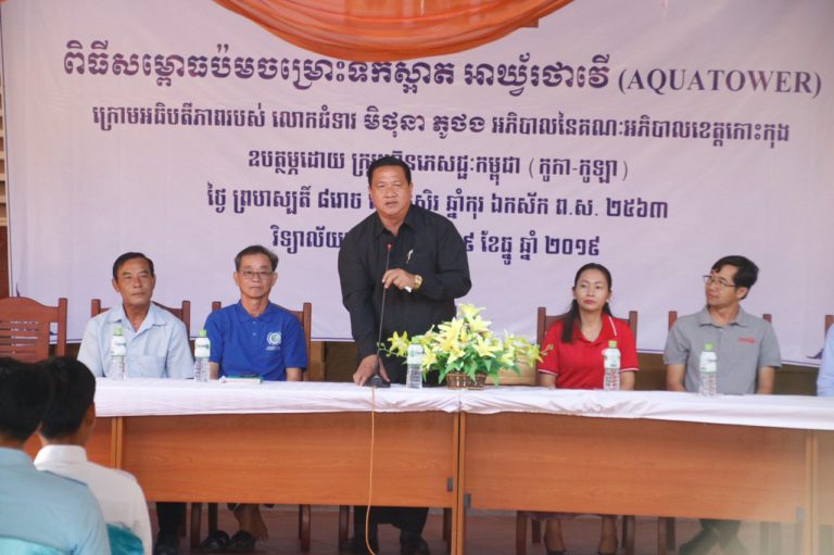លោក ស្រេង ហុង អភិបាលរង នៃគណៈអភិបាលខេត្តកោះកុង បានអញ្ជើញជាអធិបតី ក្នុងពិធីសម្ពោធប៉មច្រោះទឹកស្អាត អាឃ្វ័រថាវើ (AQUATOWER) ដែលឧបត្ថម្ភដោយ ក្រុមហ៊ុន ភេសជ្ជៈកម្ពុជា (កូកា-កូឡា) នៅវិទ្យាល័យកោះកុង