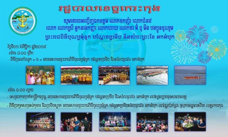 រដ្ឋបាលខេត្តកោះកុង សូមគោរពអញ្ជើញ ឯកឧត្តម លោកឧកញ៉ា លោកជំទាវ លោក លោកស្រី អ្នកនាងកញ្ញា លោកយាយ លោកតា អ៊ំ ពូ មីង បងប្អូនចូលរួម ក្នុងព្រះរាជពិធីបុណ្យអុំទូក បណ្ដែតប្រទីប និងសំពះព្រះខែ អកអំបុក នាព្រឹកថ្ងៃទី១១ ខែវិច្ឆិកា ឆ្នាំ២០១៩ ចាប់ពីវេលាម៉ោង ៨ ព្រឹកតទៅ